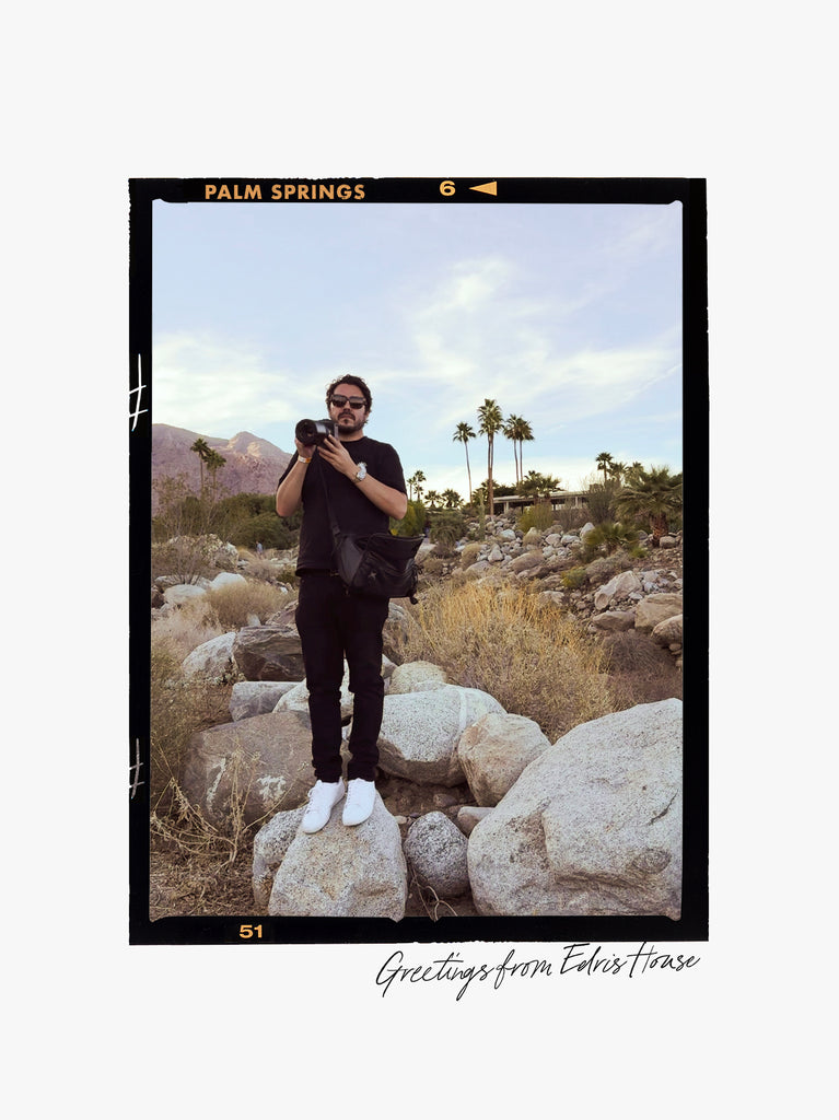 Palm Springs heat, a cowboy and his horse share the frame with a classic Porsche in front of the Edris House.