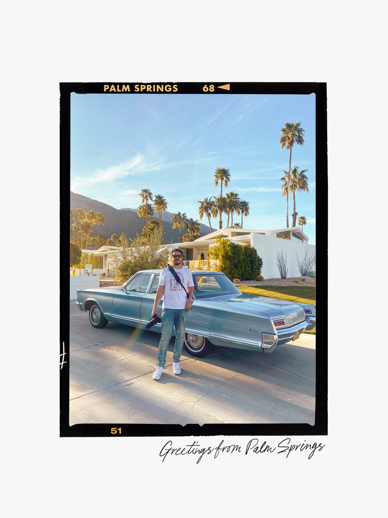 This piece features two wolves on top of a classic car, set against the iconic backdrop of Palm Springs California.