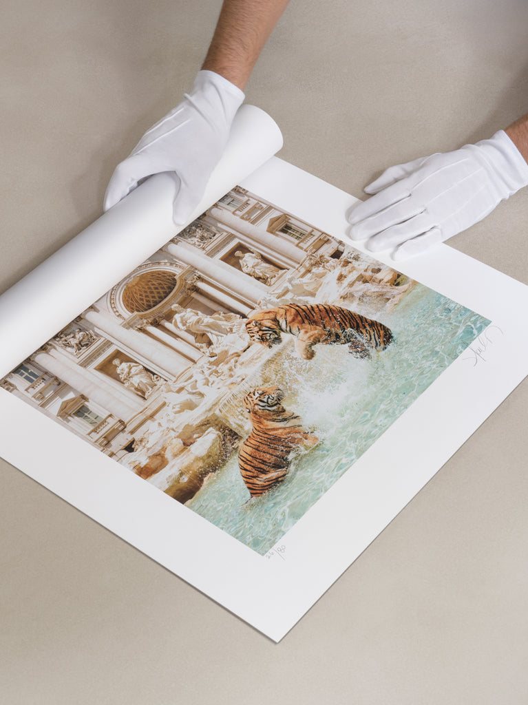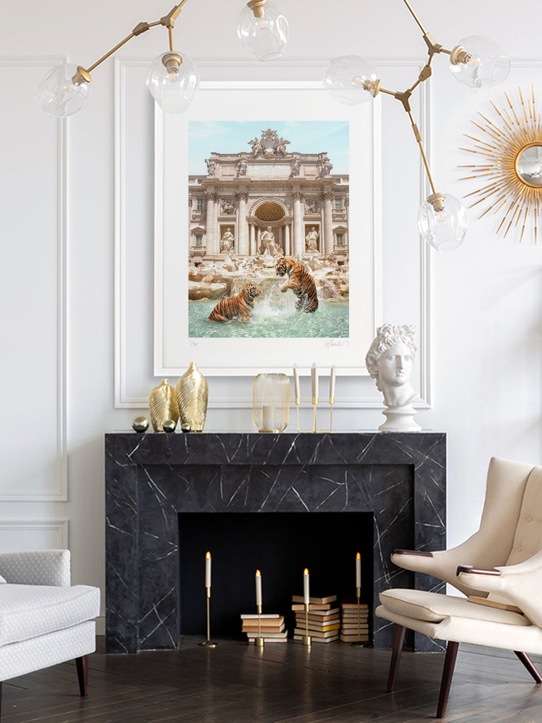 A playful scene of two tigers splashing in the most iconic fountain of Rome.